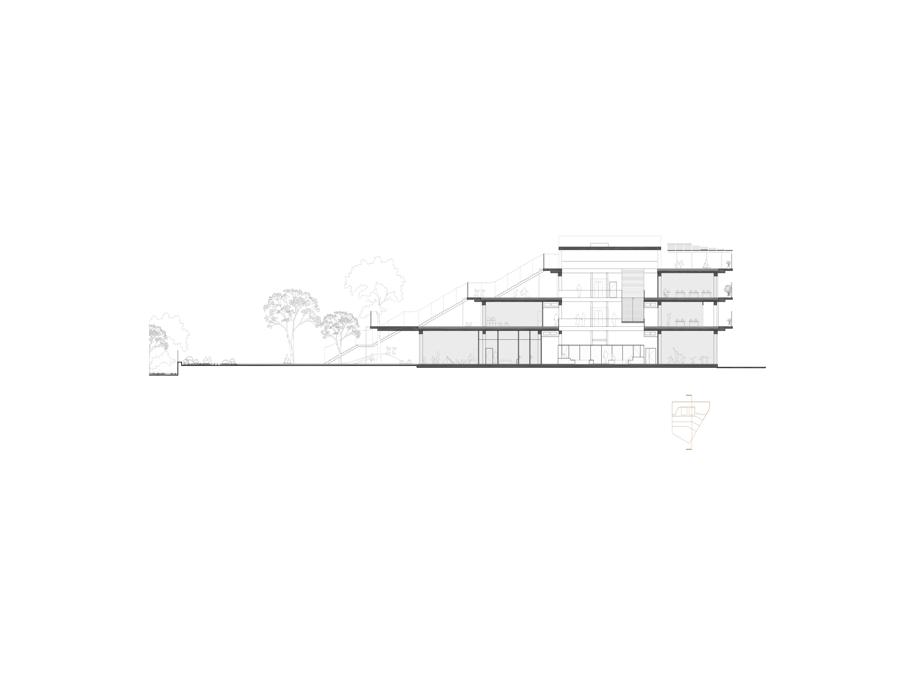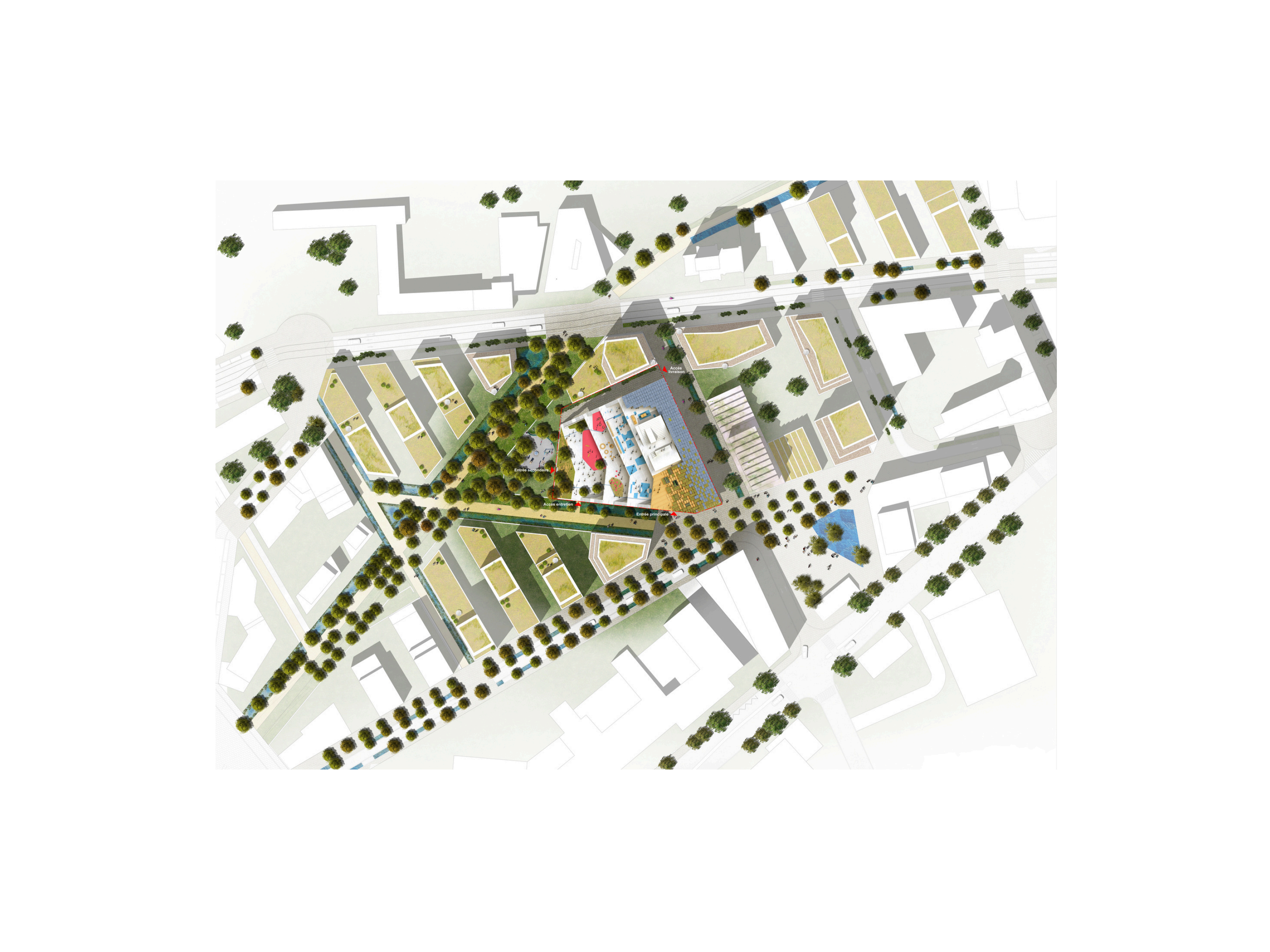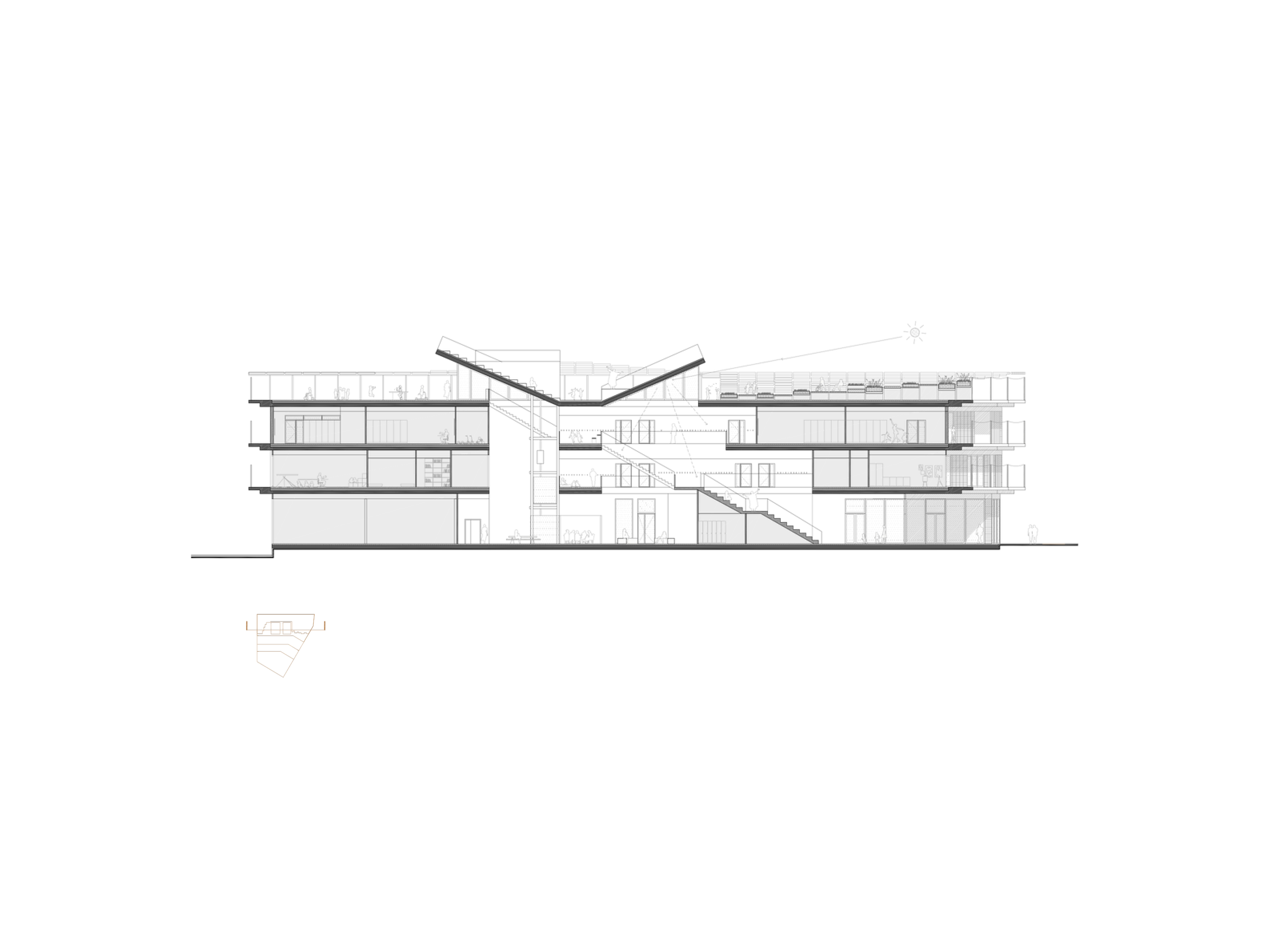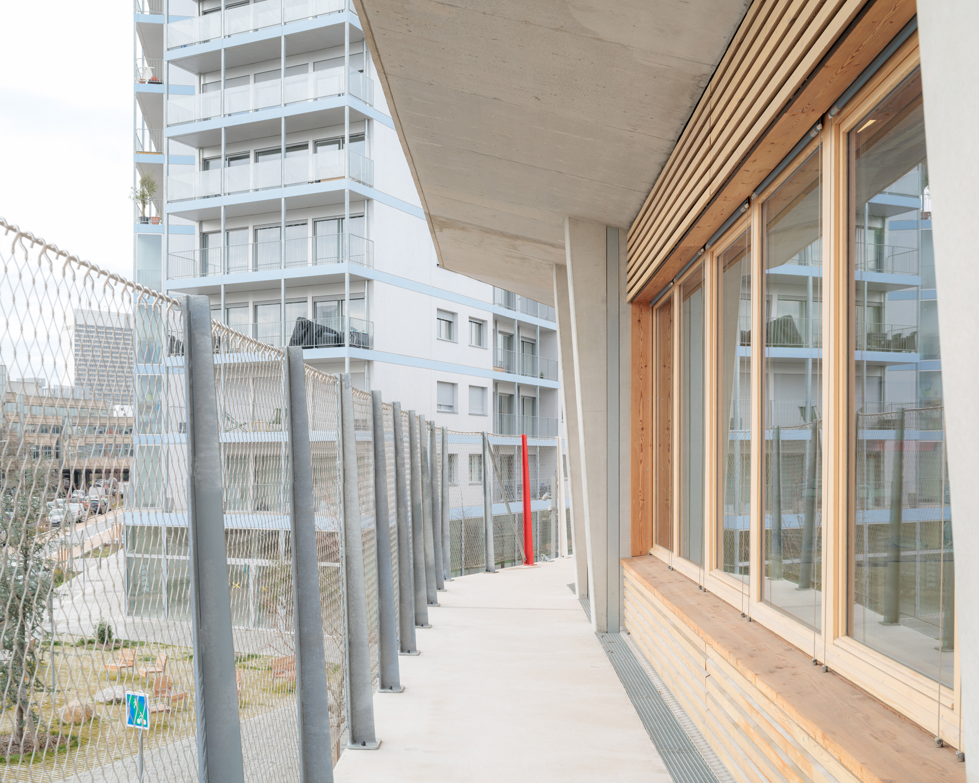 Pour cela, sa volumétrie et sa structure sont les plus rationnelles possible, les plus évidentes même, car générées par la géométrie du site et une règle simple : constituer un front bâti sur rue et s’ouvrir sur le jardin du rail, répondant ainsi aux enjeux urbains et environnementaux.