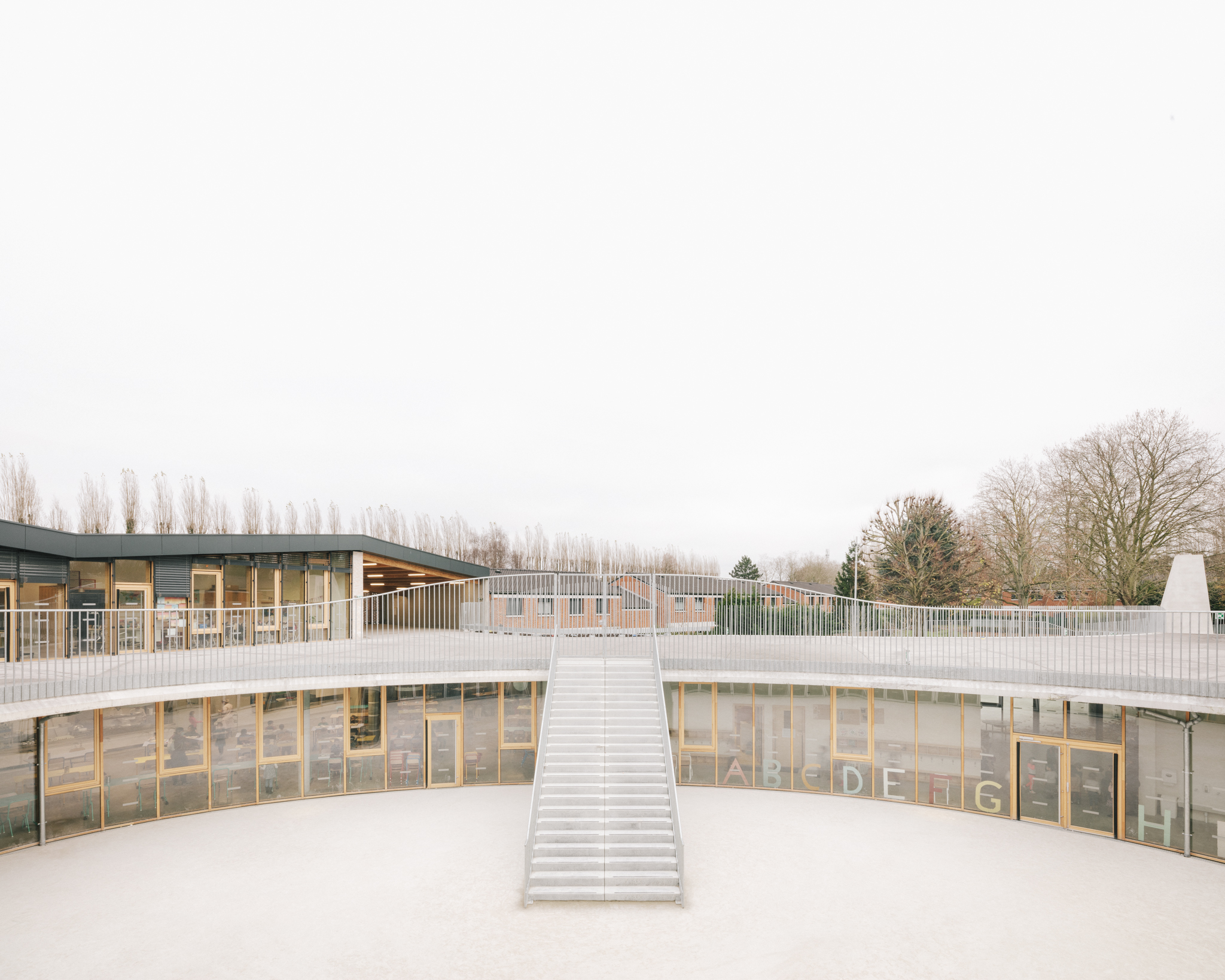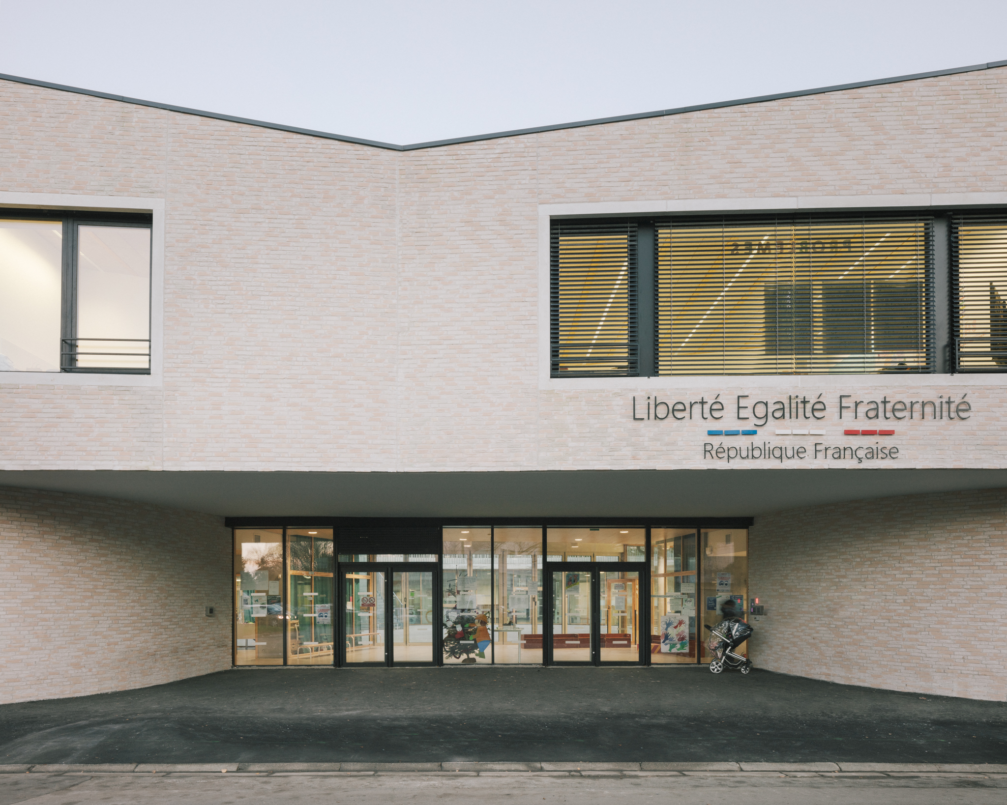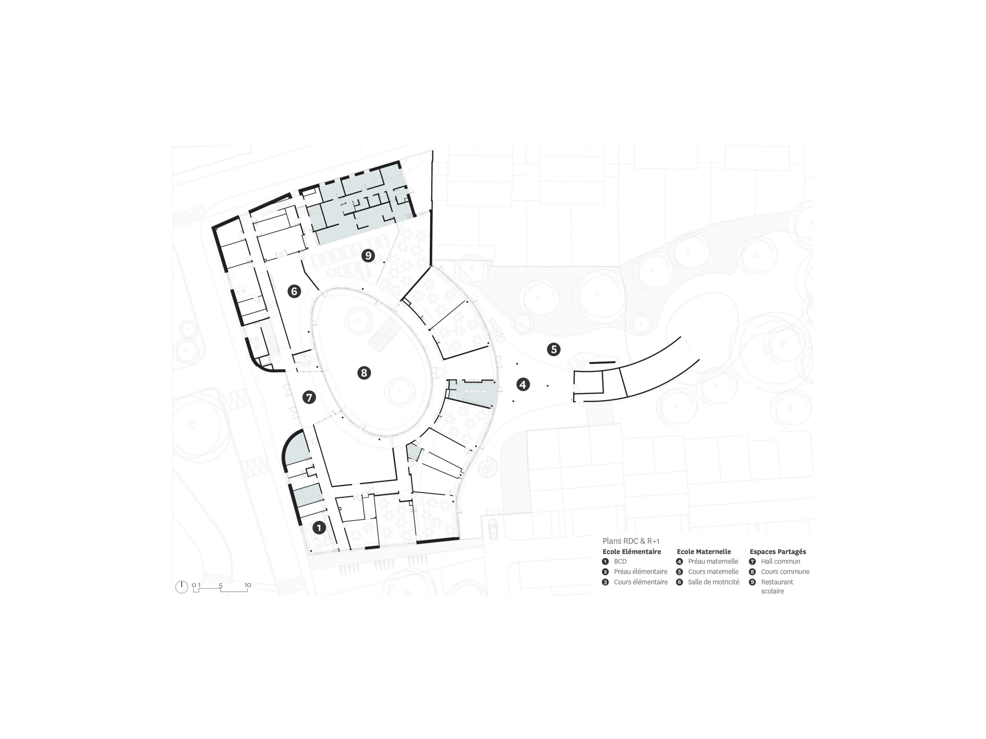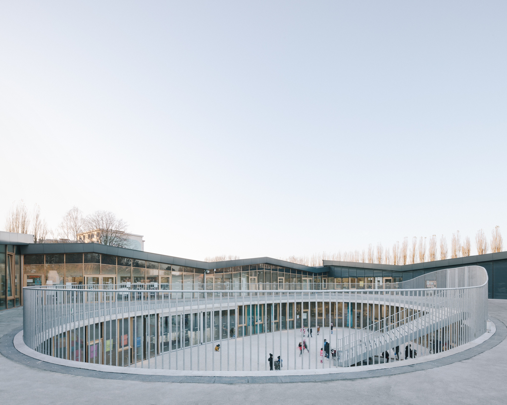 Son organisation verticale situe au rez-de- chaussée les locaux périscolaires ouverts sur la ville et pouvant être facilement utilisés en dehors des horaires scolaires (brocante, fête de quartier…), et à l’étage les espaces sanctuarisés des salles de classe, mis à l’écart et facilement contrôlables.