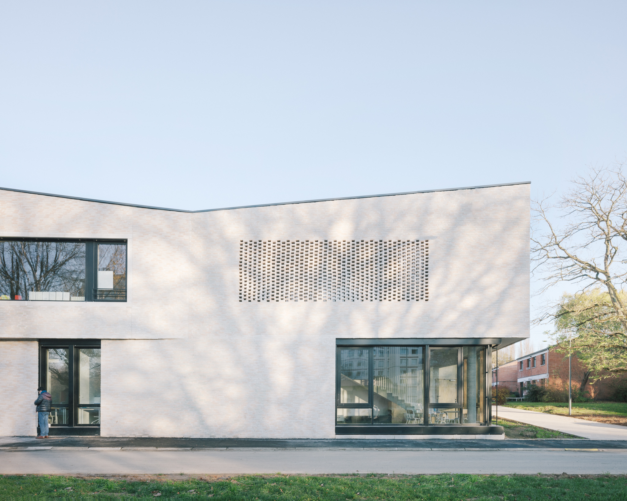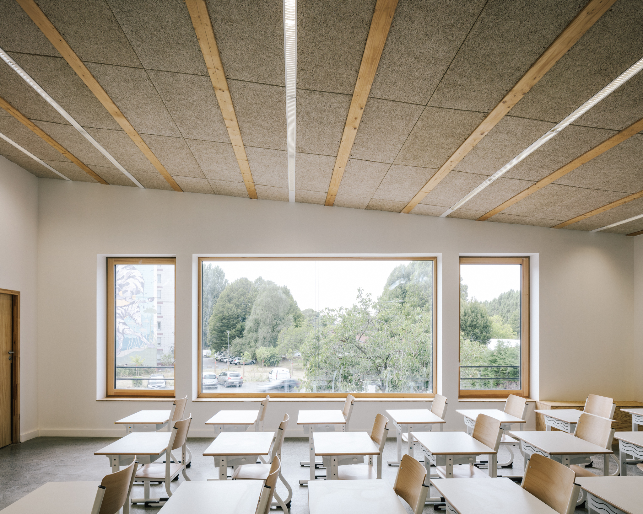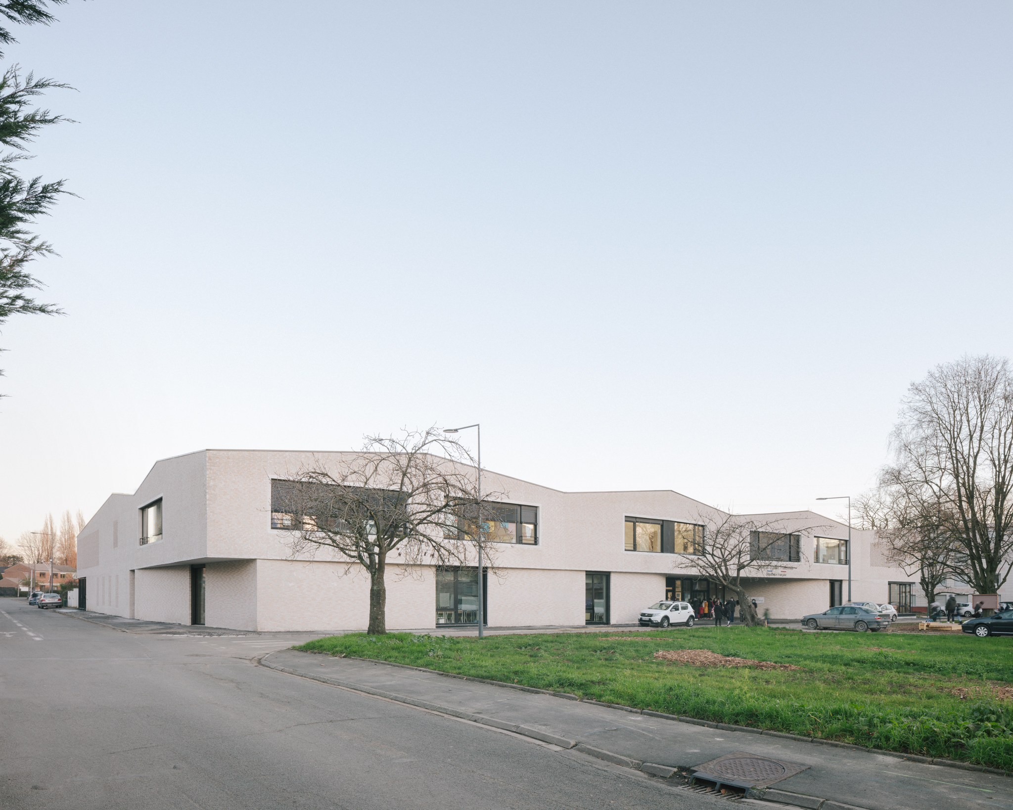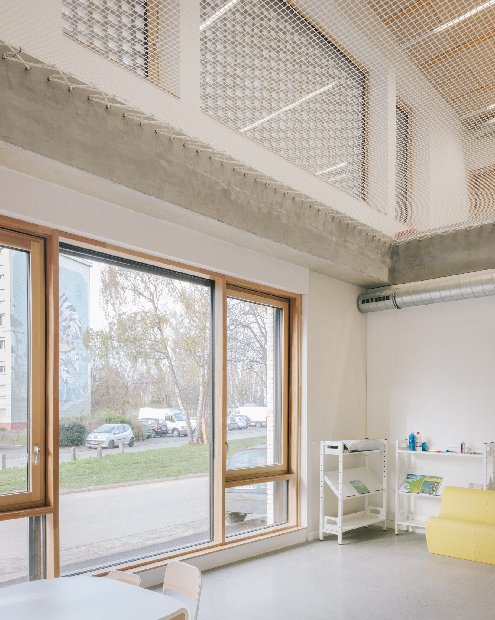 Son organisation verticale situe au rez-de- chaussée les locaux périscolaires ouverts sur la ville et pouvant être facilement utilisés en dehors des horaires scolaires (brocante, fête de quartier…), et à l’étage les espaces sanctuarisés des salles de classe, mis à l’écart et facilement contrôlables.