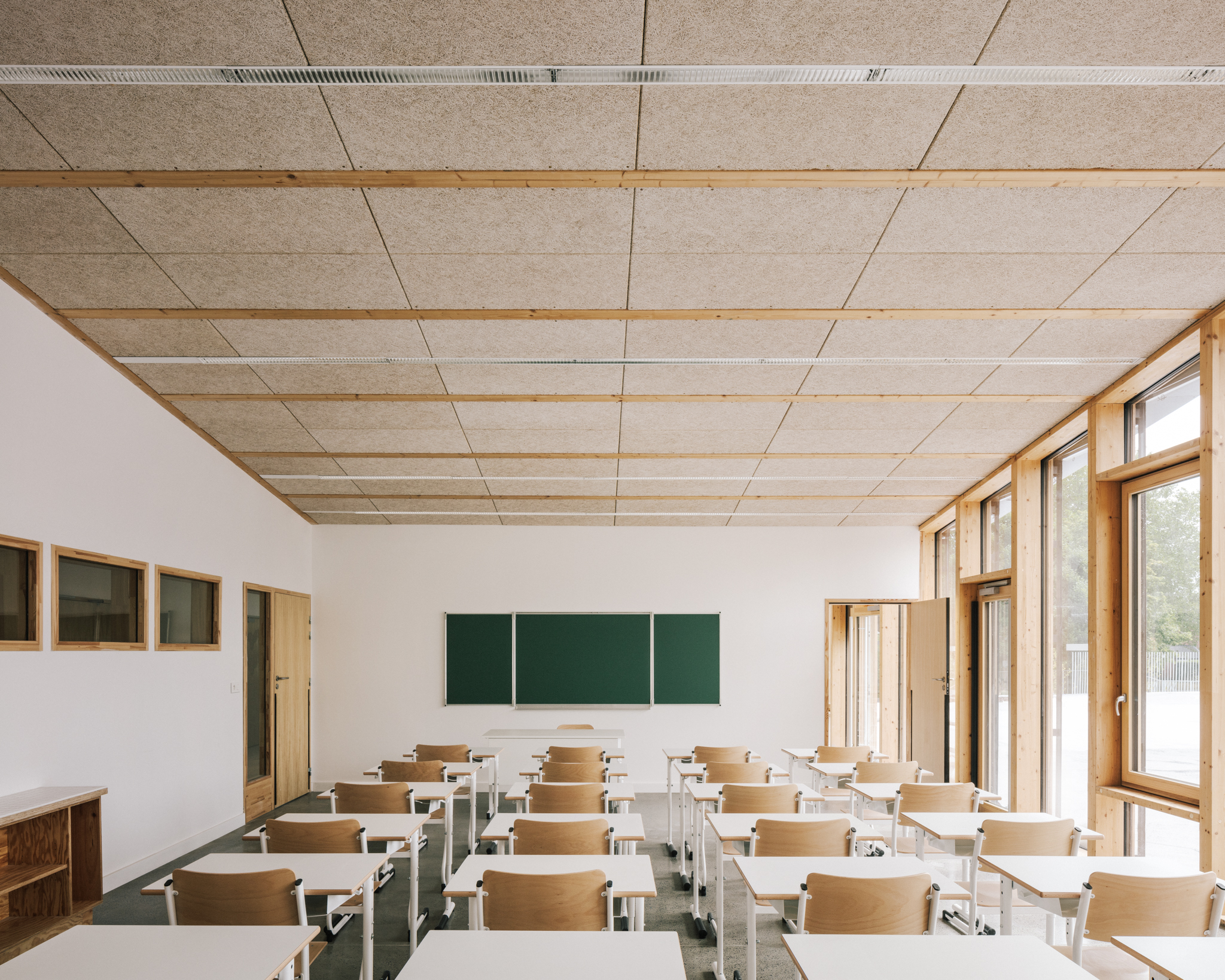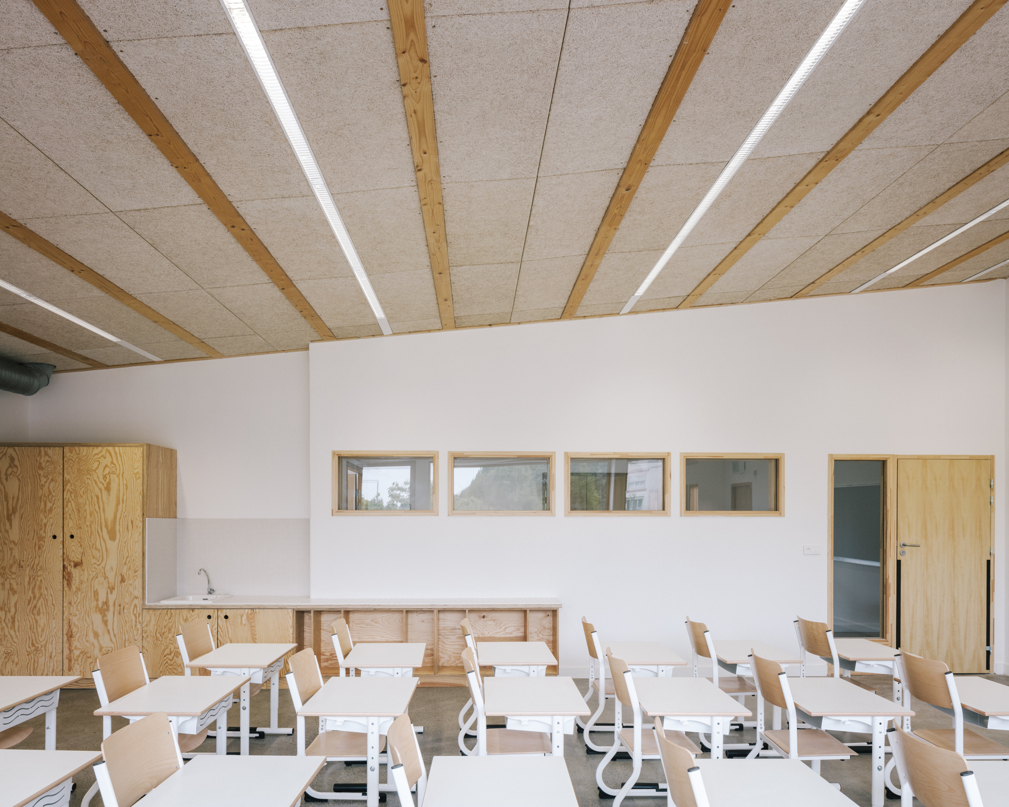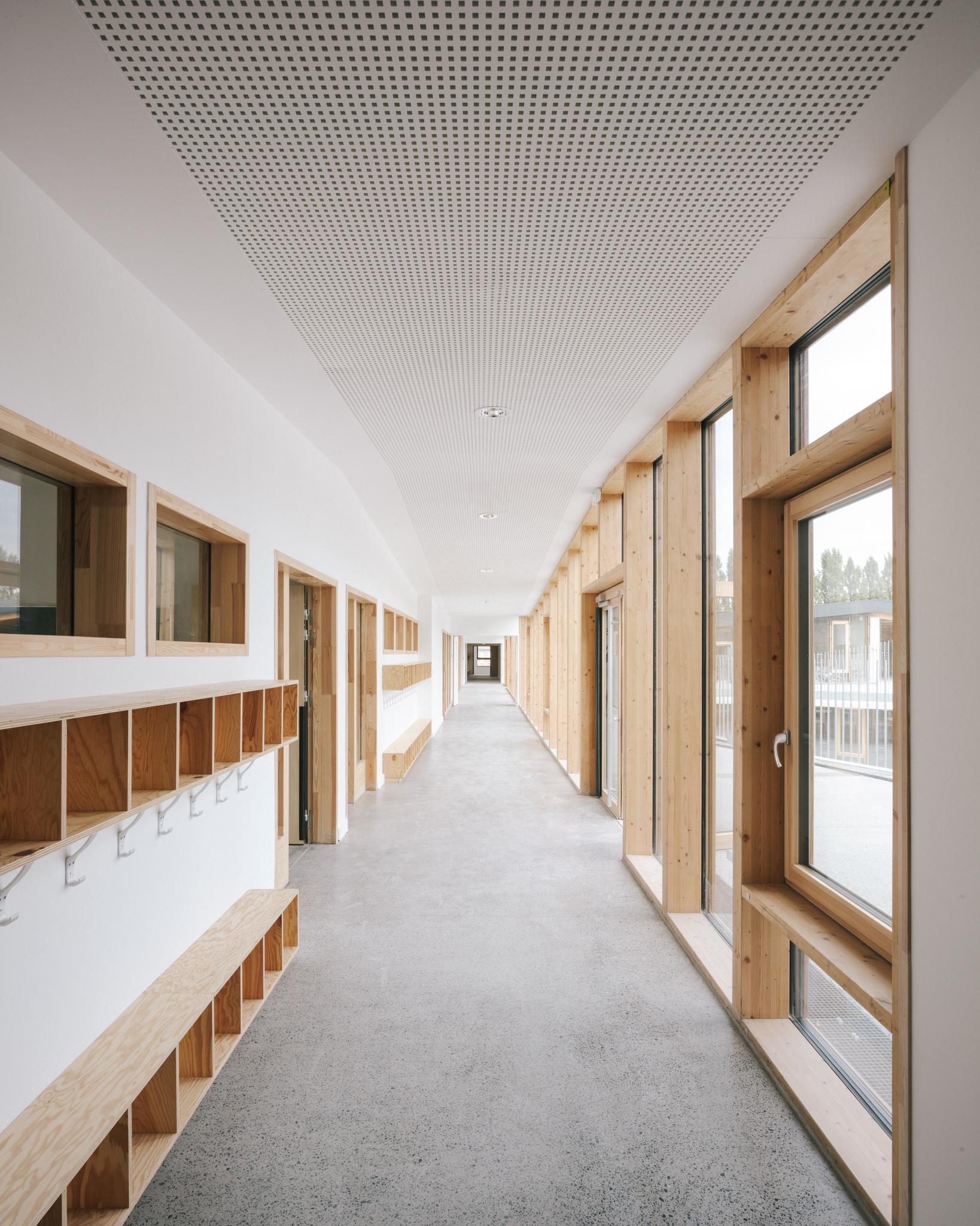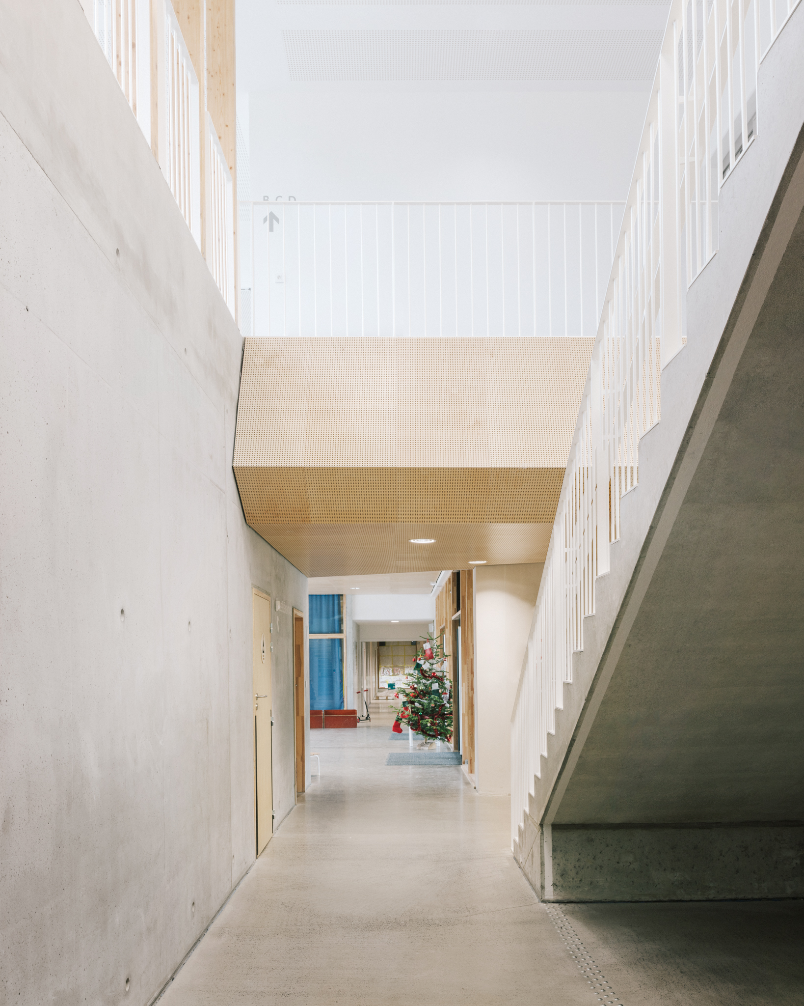 Son organisation verticale situe au rez-de- chaussée les locaux périscolaires ouverts sur la ville et pouvant être facilement utilisés en dehors des horaires scolaires (brocante, fête de quartier…), et à l’étage les espaces sanctuarisés des salles de classe, mis à l’écart et facilement contrôlables.