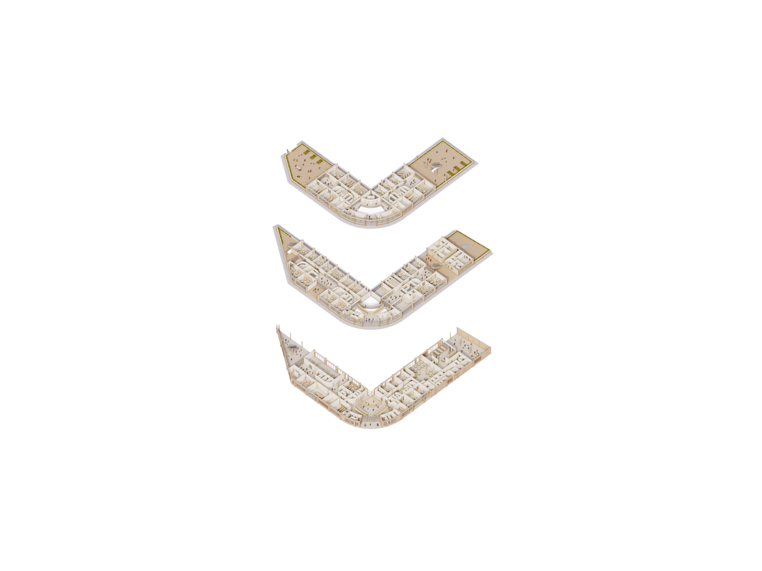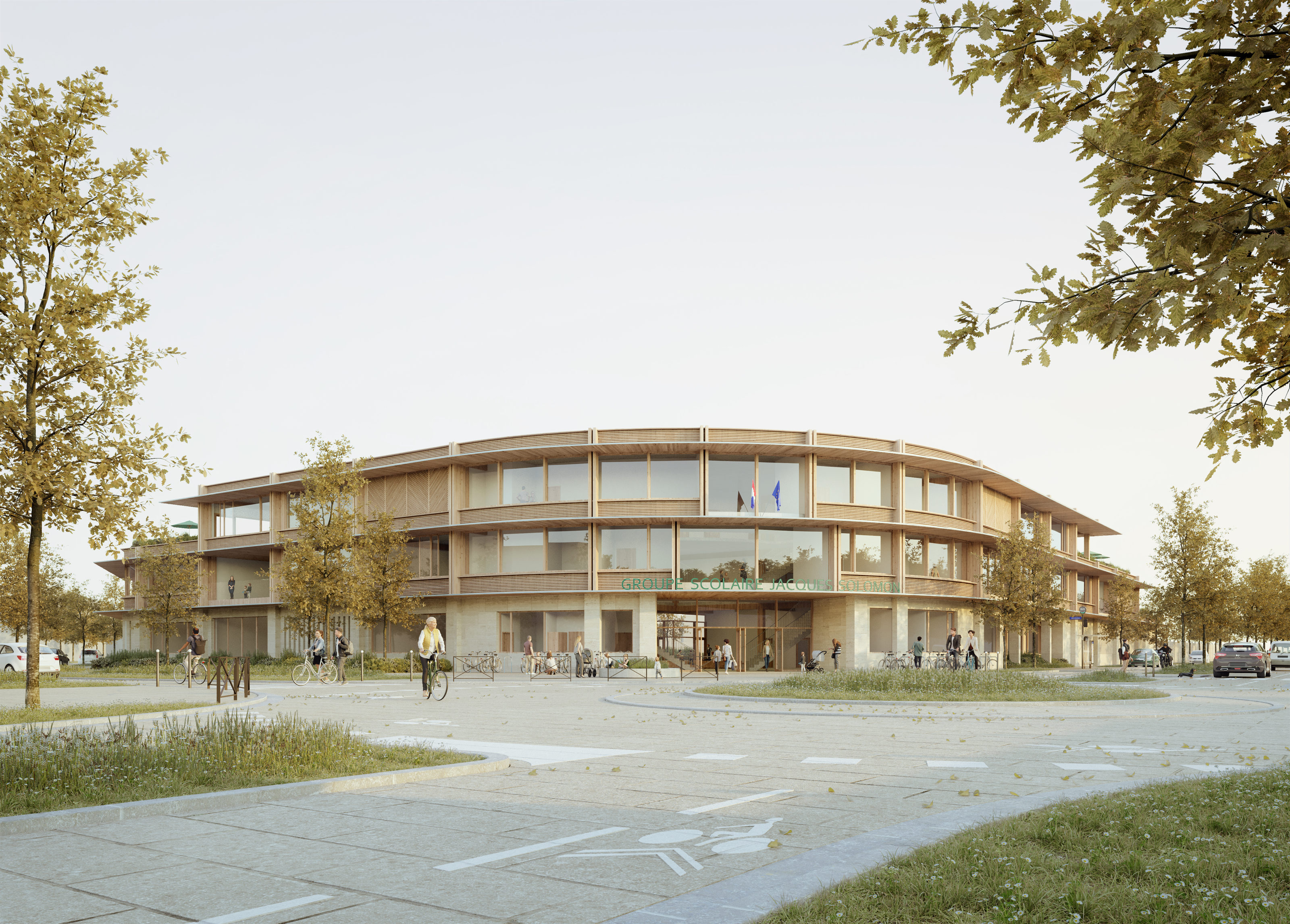 La figure urbaine du groupe scolaire reprend une forme géométrique simple et universelle : l’équerre, une figure qui permet d’organiser deux ailes autour d’un hall central qui dessert directement l’ensemble des pôles programmatiques.
