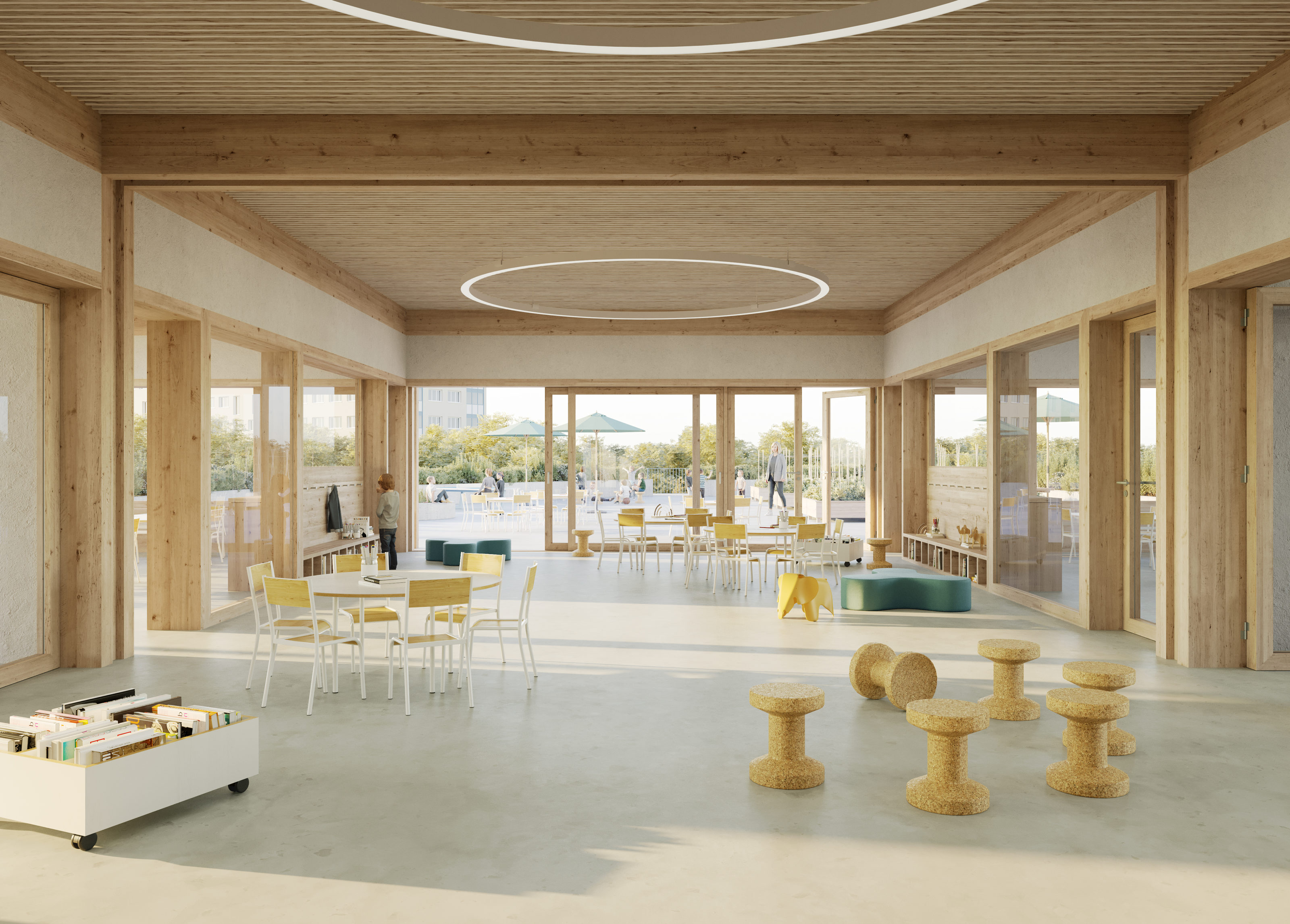 La cour végétale et les multiples terrasses plantées, perceptibles depuis l’espace public, prolongent visuellement cette promenade verdoyante jusqu’au sein de l’équipement, l’intégrant ainsi naturellement dans un nouveau cadre de vie bucolique et rafraîchissant.
