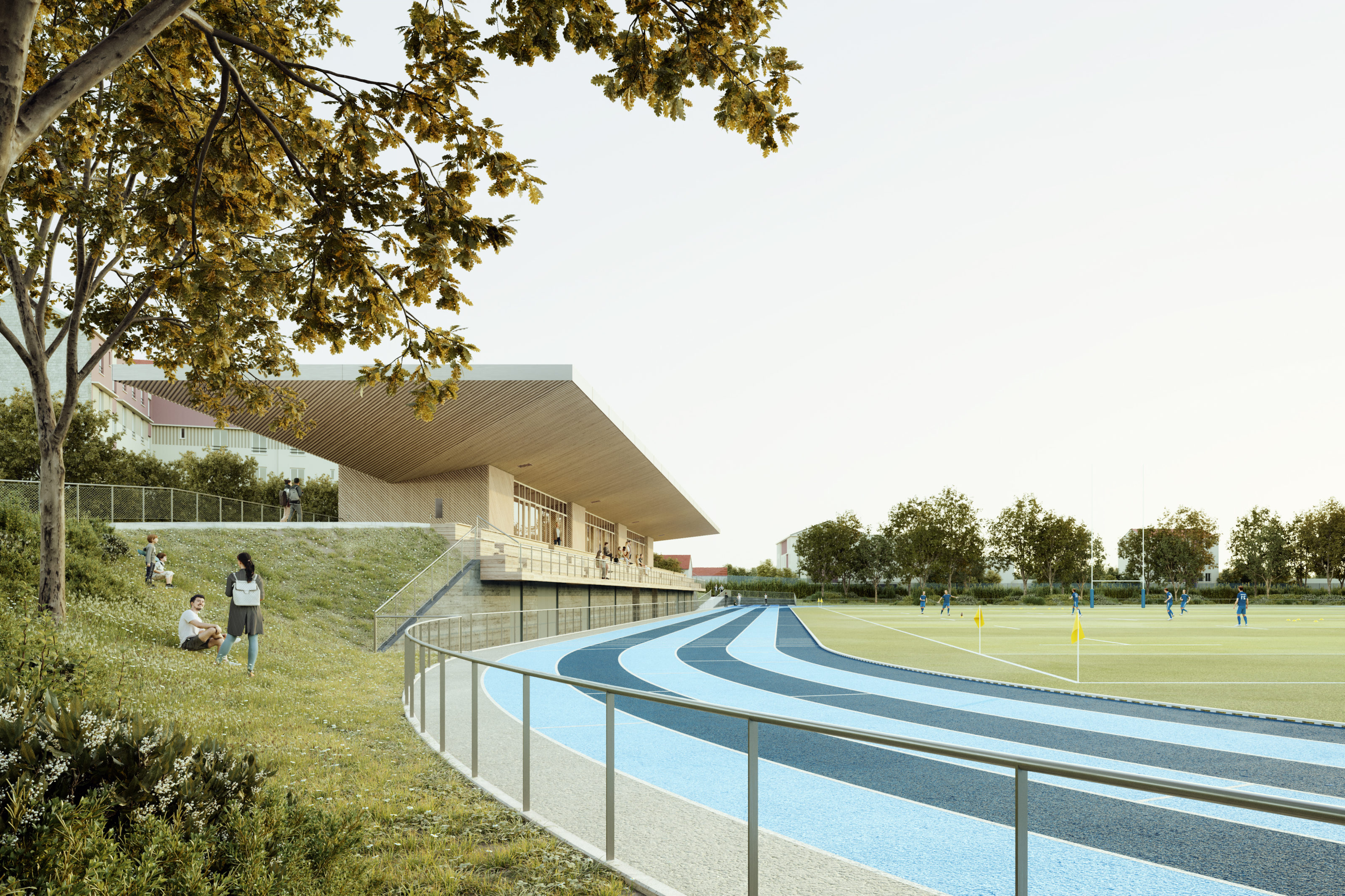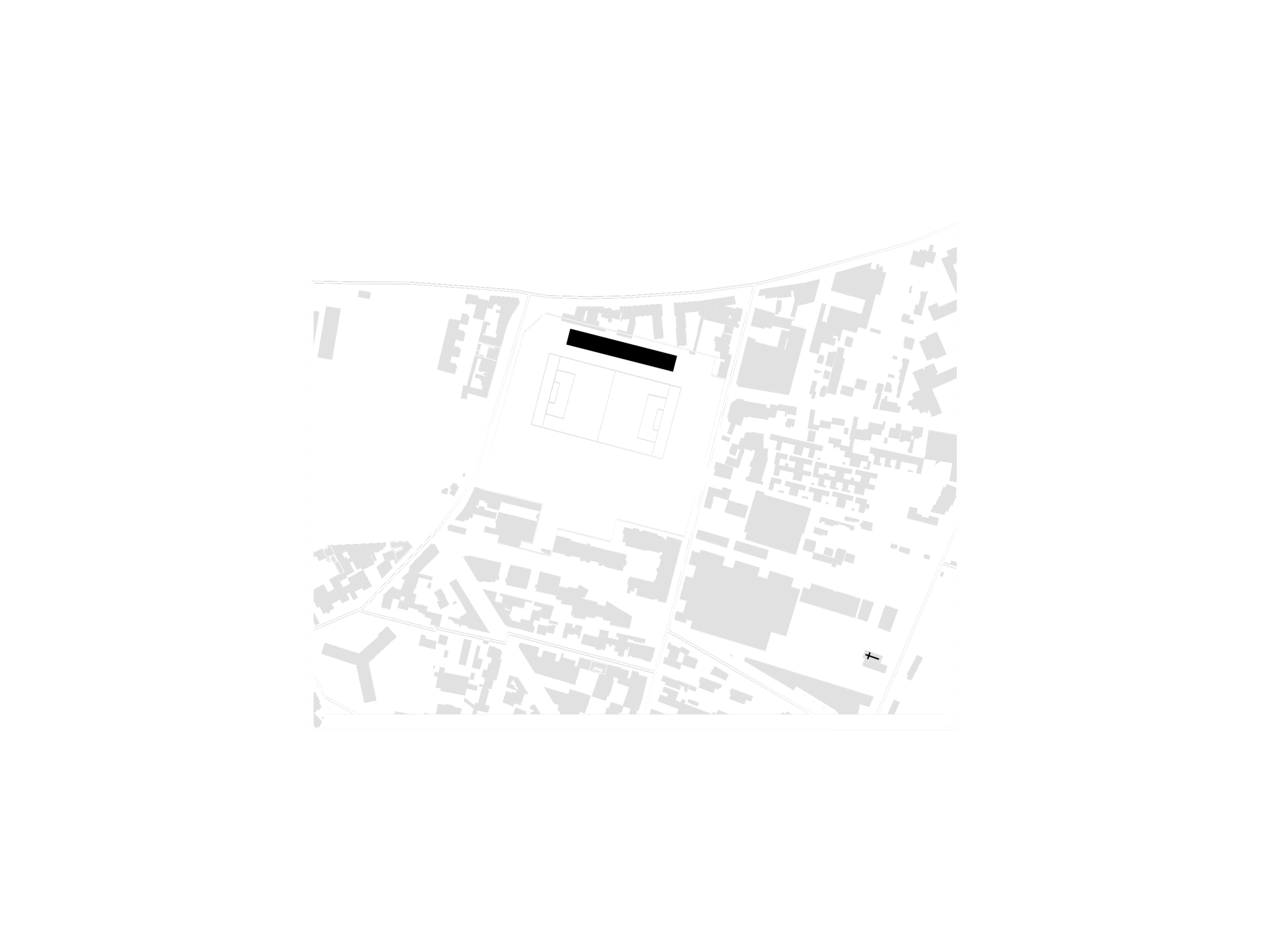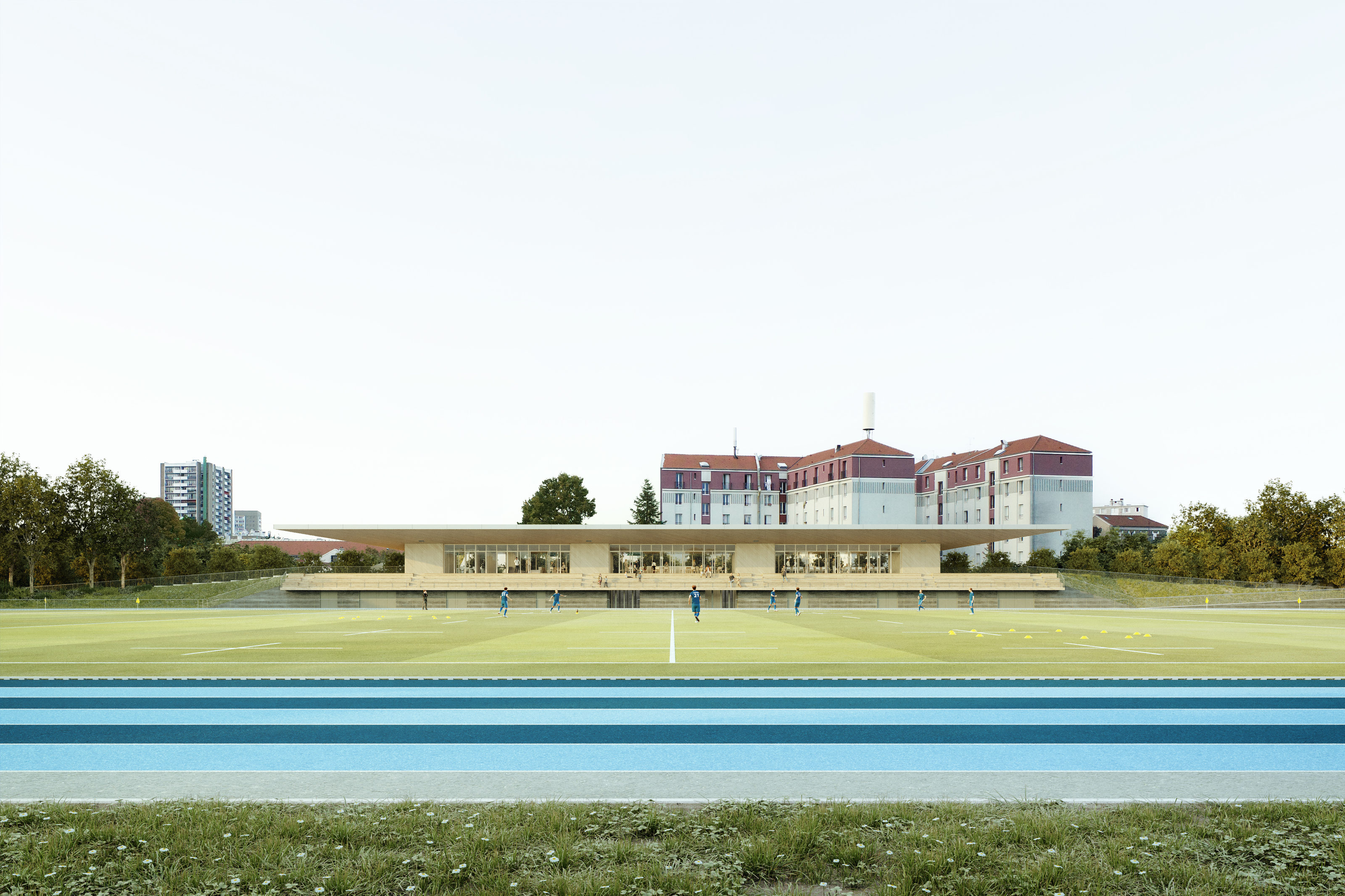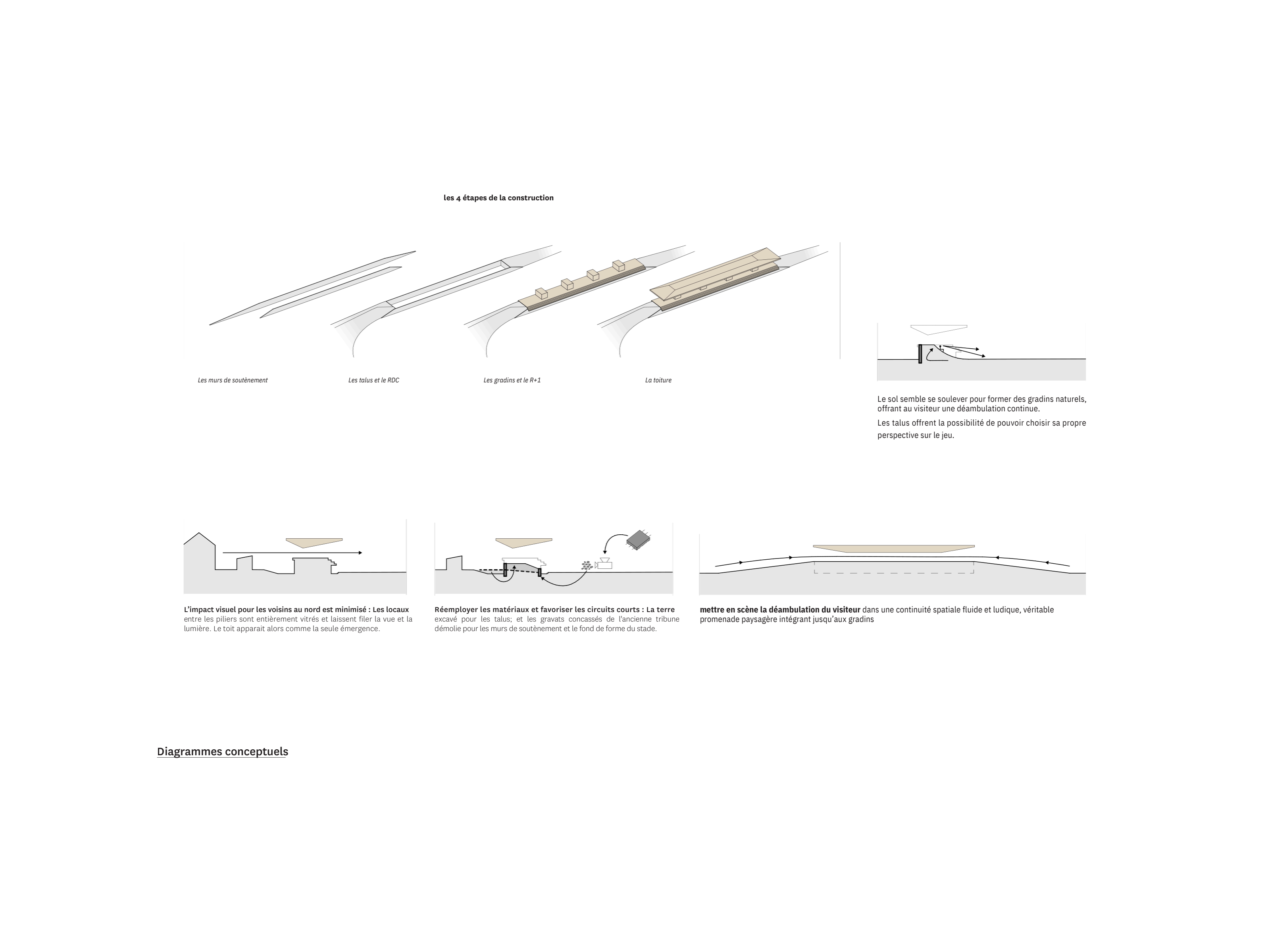 Le projet minimise son impact visuel dans le quartier et à offre une insertion douce pour les riverains. Il réinterprète la typologie classique de la tribune en trois parties : Un socle, enfoui dans le jeu topographique du terrain. Il appartient au monde tellurique, telle une habitation troglodyte.