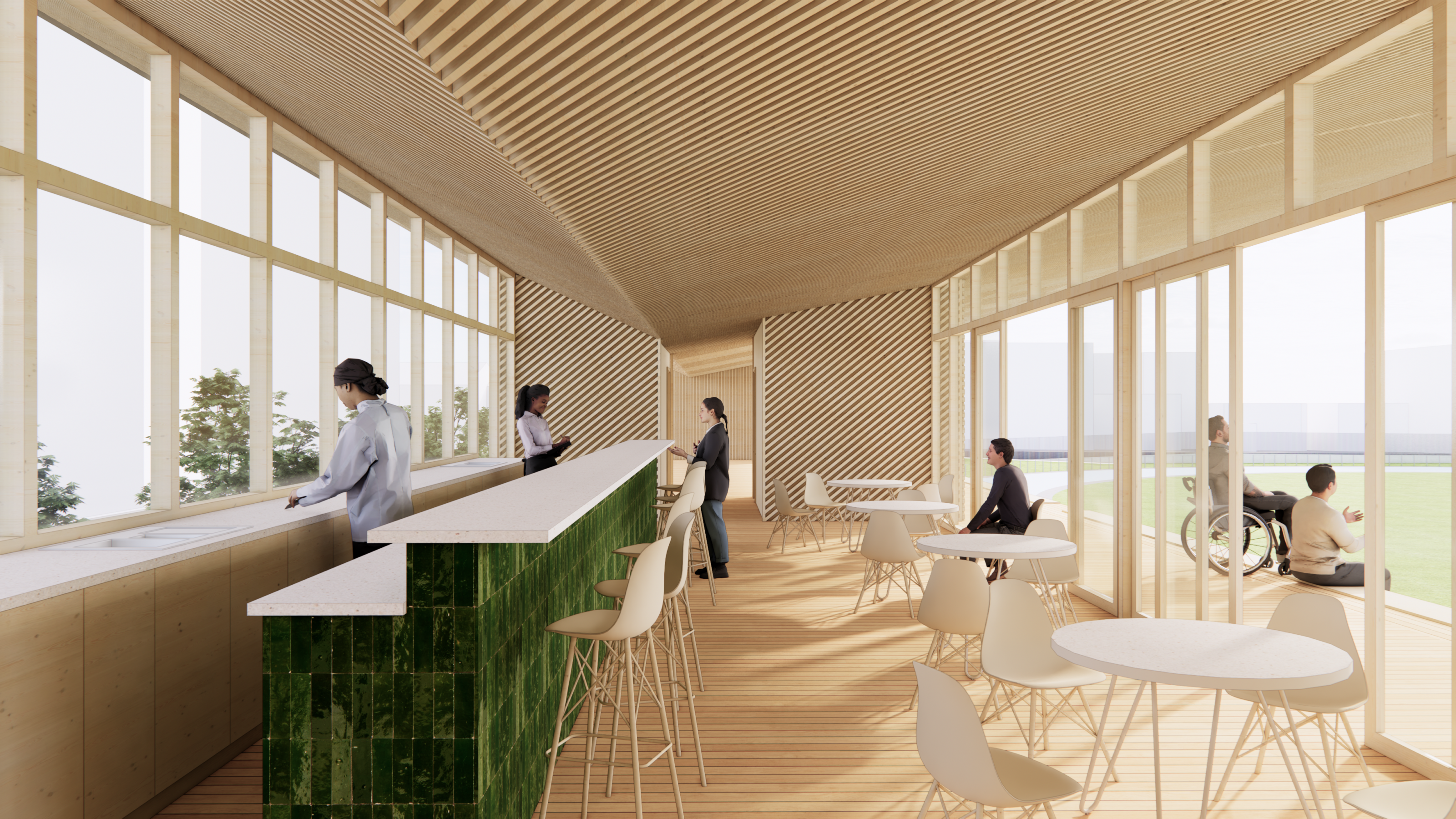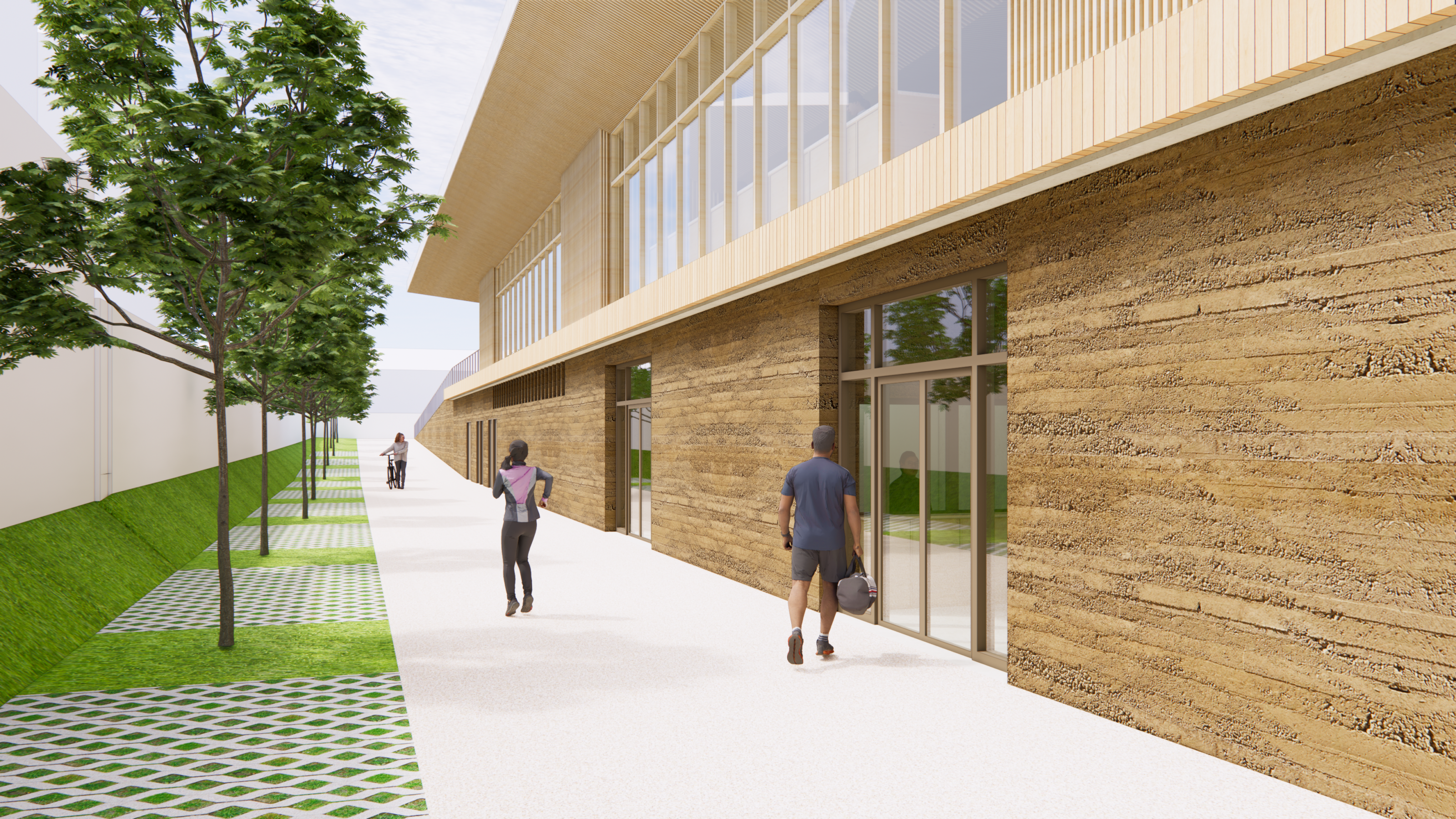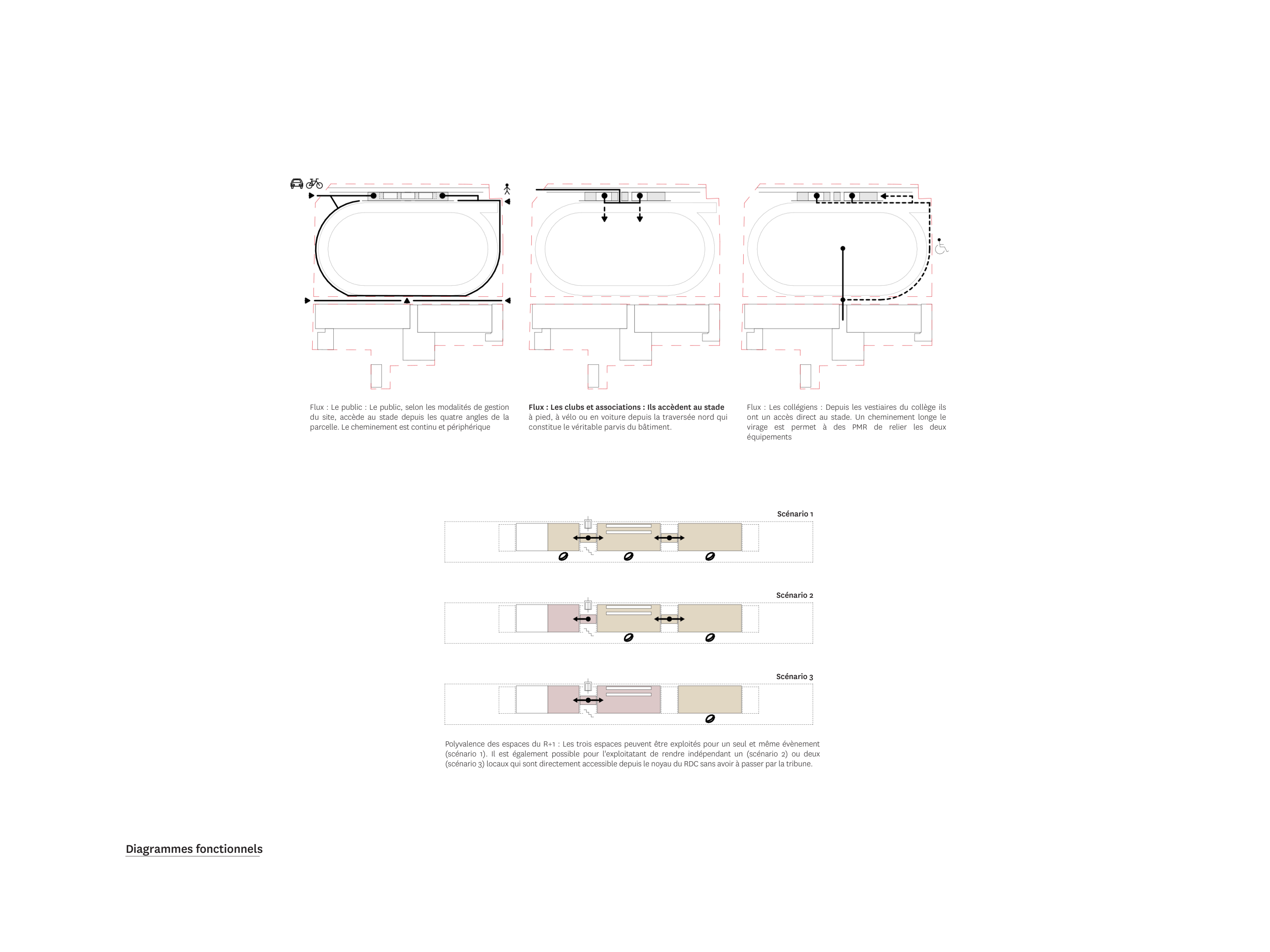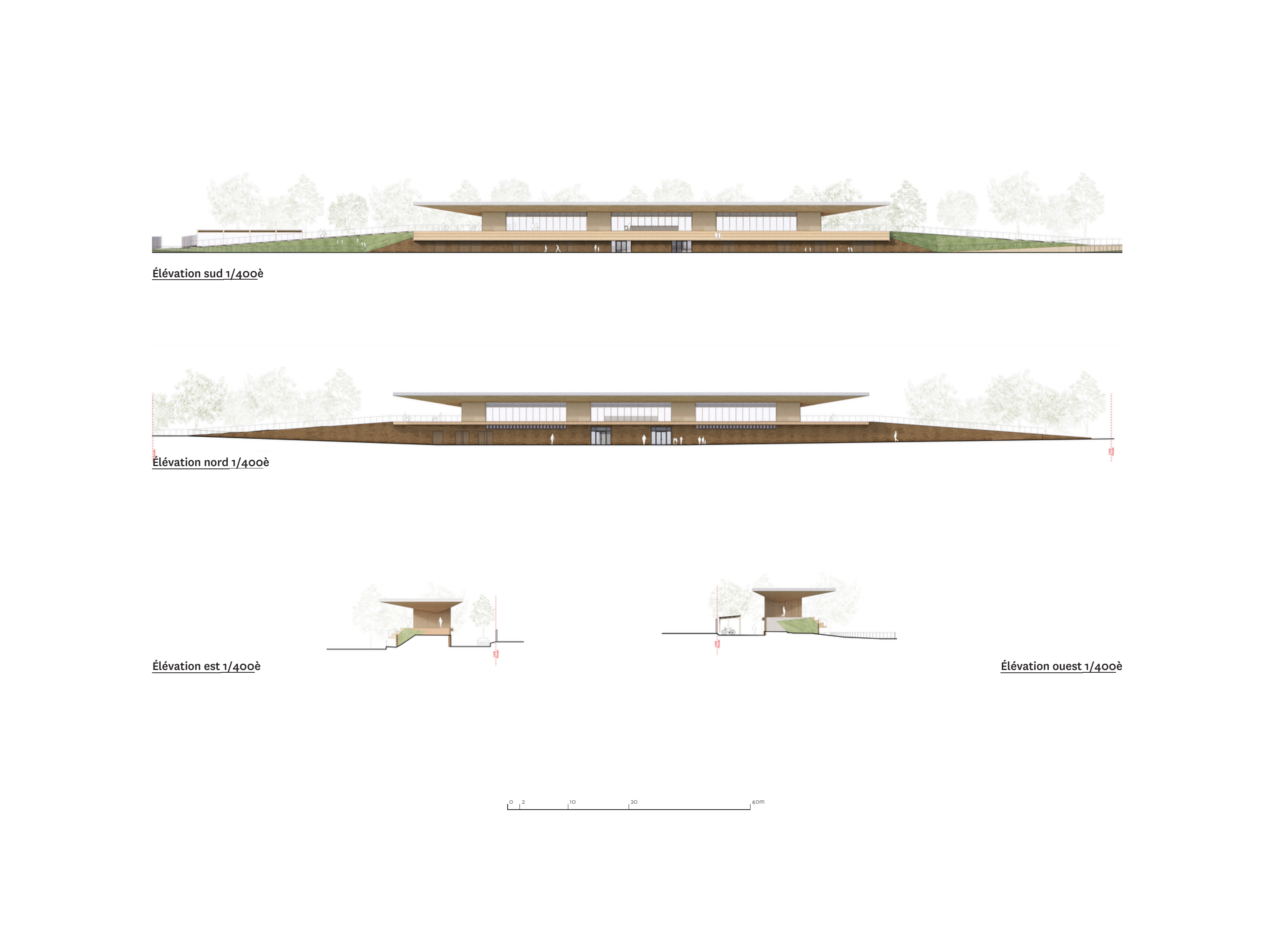 Le projet minimise son impact visuel dans le quartier et à offre une insertion douce pour les riverains. Il réinterprète la typologie classique de la tribune en trois parties : Un socle, enfoui dans le jeu topographique du terrain. Il appartient au monde tellurique, telle une habitation troglodyte.
