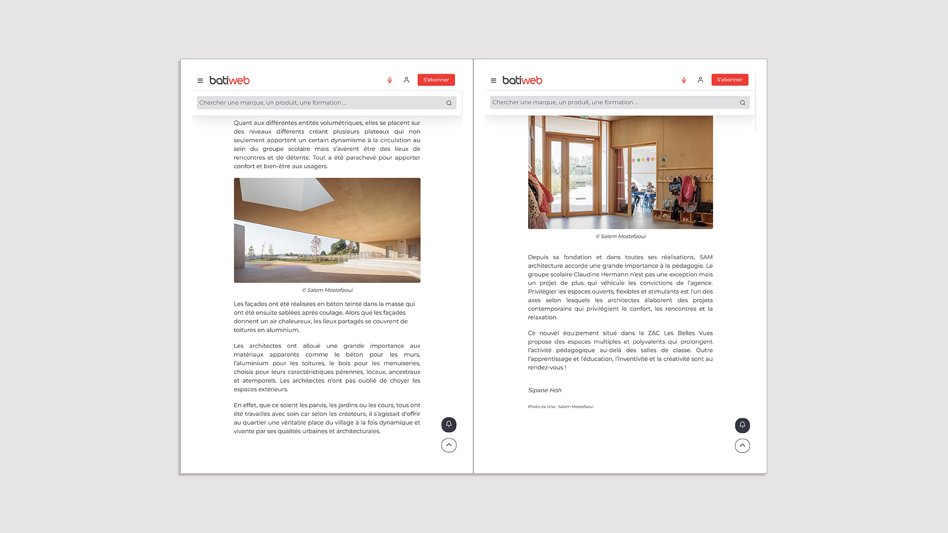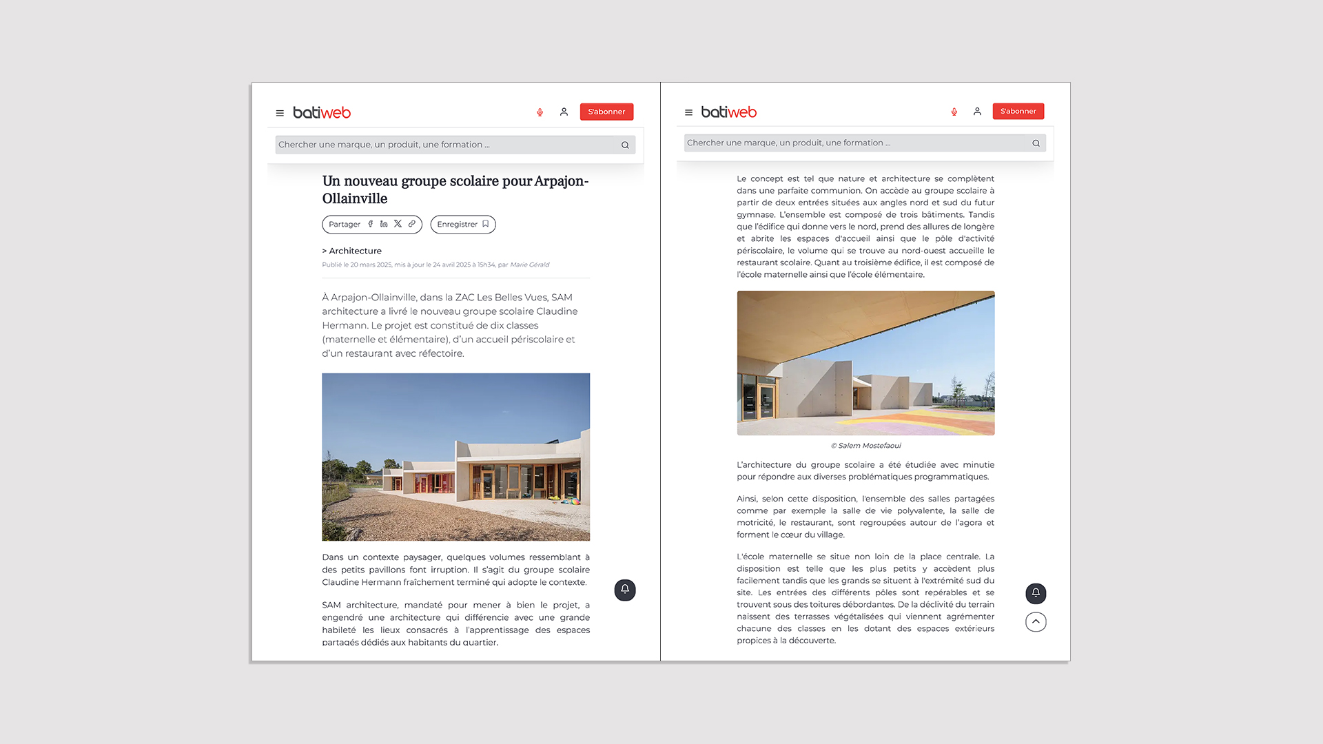 Batiweb – Groupe scolaire Claudine Hermann Magazine : batiweb Année : 2025 Site magazine : https://www.batiweb.com/actualites/architecture/un-nouveau-groupe-scolaire-pour-arpajon-ollainville-46069 Thématique : Groupe scolaire Claudine Hermann, pédagogie innovante