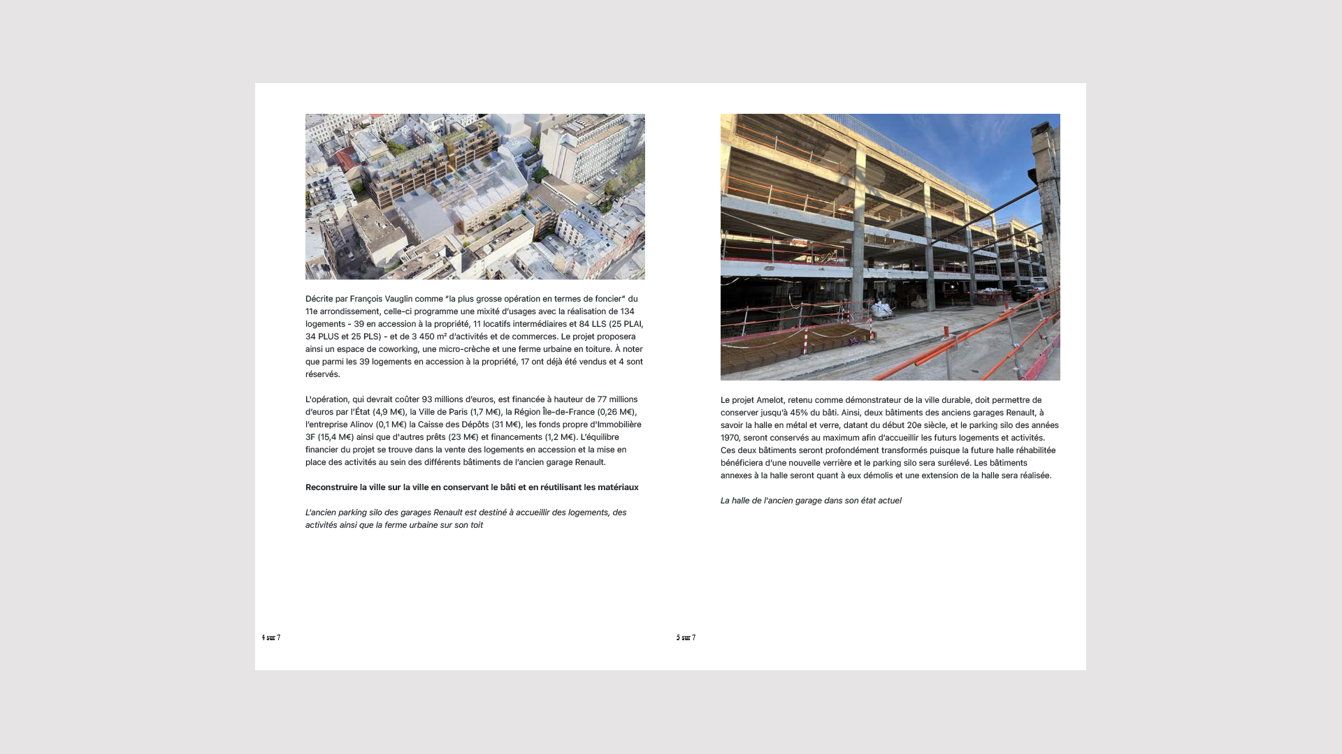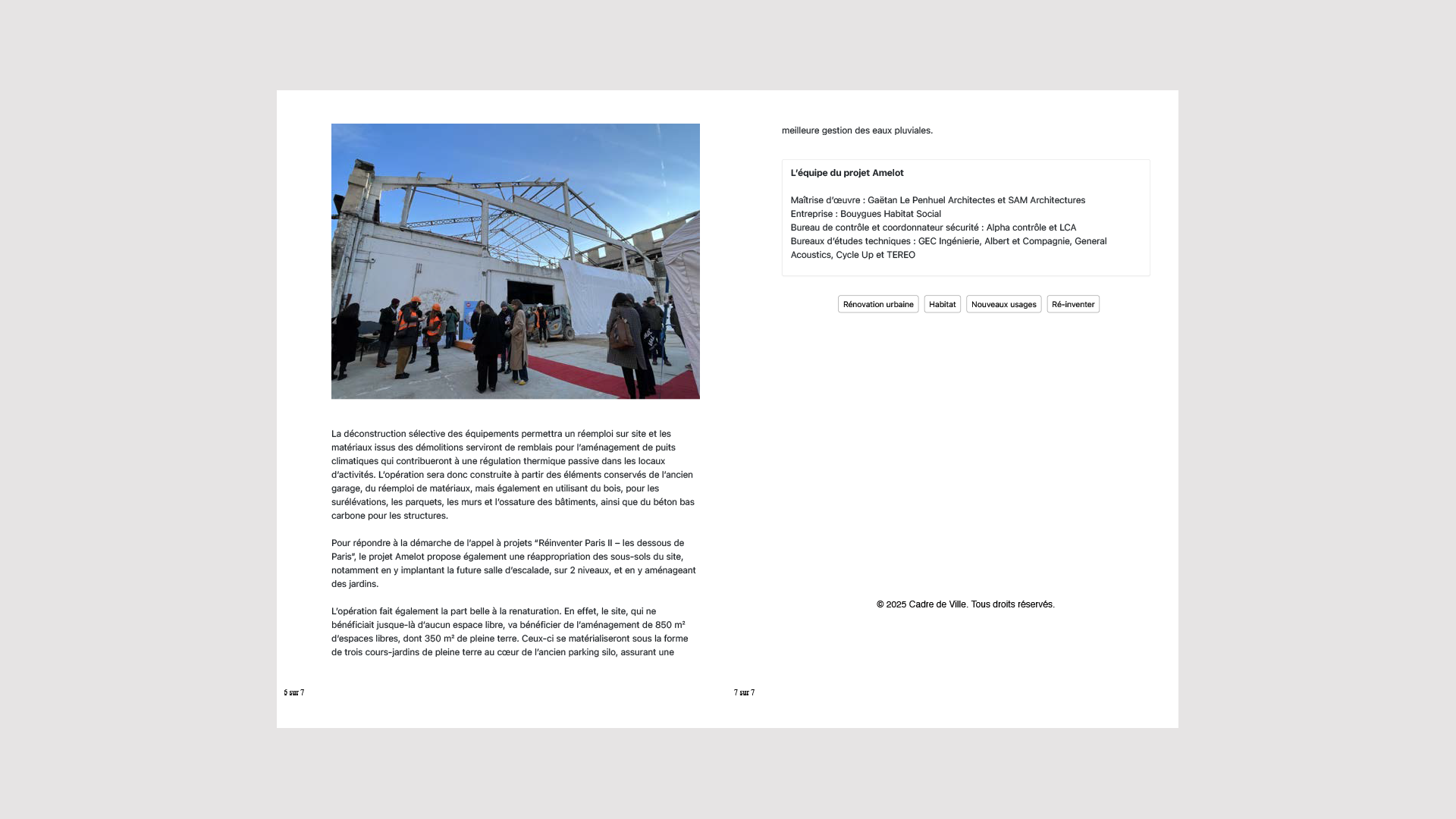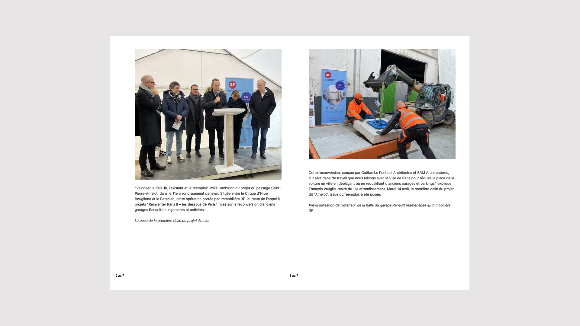Cadre de ville – Projet Amelot Magazine : Cadre de ville Année : 2025 Site magazine : https://www.cadredeville.com/ville/paris-immobiliere-3f-pose-la-premiere-dalle-de-reemploi-du-projet-amelot Thématique : garage Amelot
