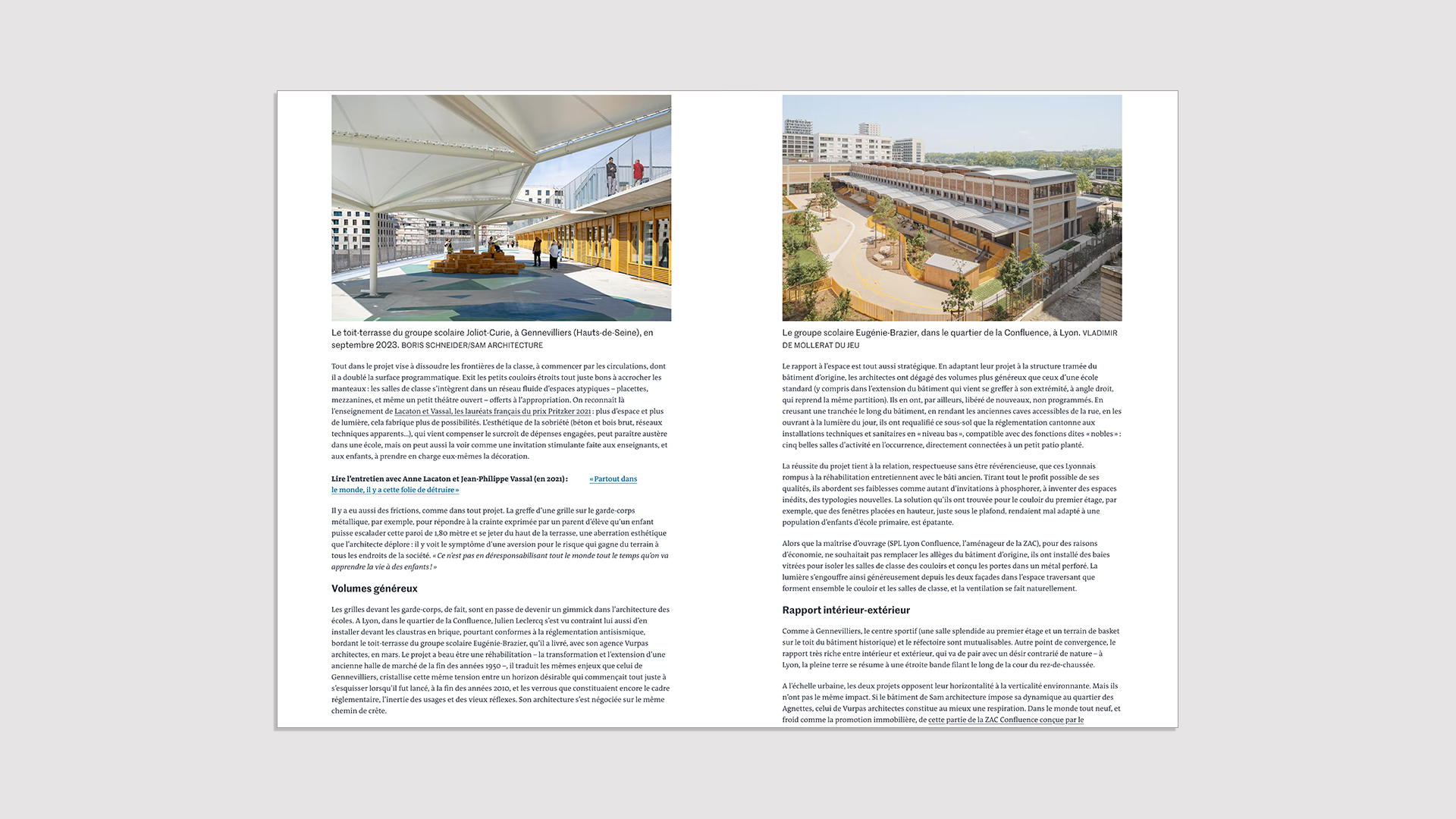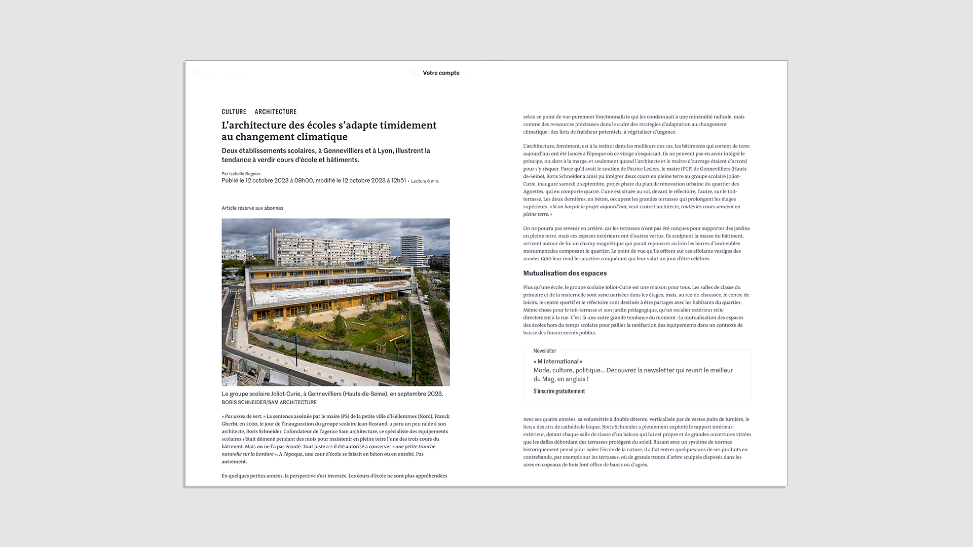 Le Monde – Groupe scolaire Joliot Curie Magazine : le monde Année : 2023 Site magazine : https://www.lemonde.fr/culture/article/2023/10/12/l-architecture-des-ecoles-s-adapte-timidement-au-changement-climatique_6193930_3246.html Thématique : Groupe scolaire Joliot Curie, Gennevilliers, pédagogie innovante