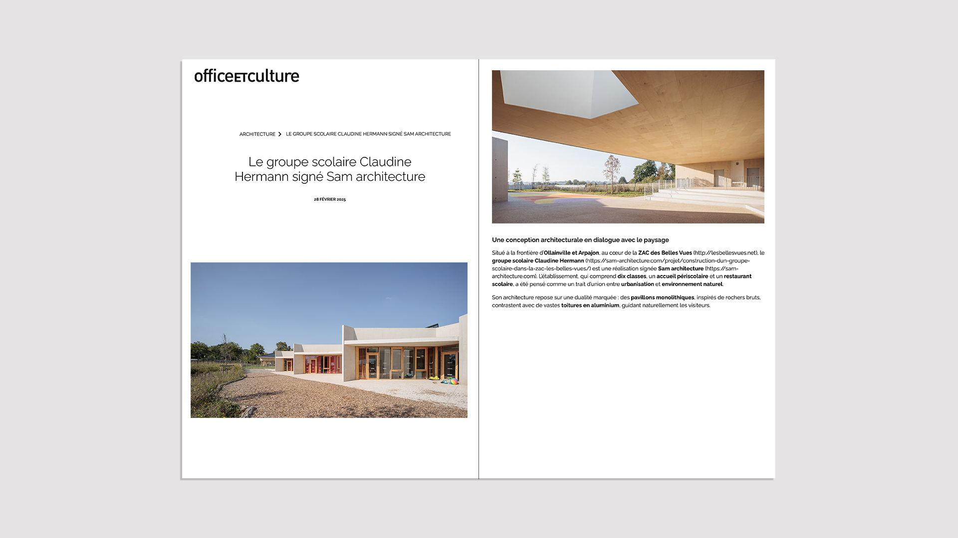 Office et Culture – Groupe scolaire Claudine Hermann Magazine : office et culture Année : 2025 Site magazine : https://www.office-et-culture.fr/le-groupe-scolaire-claudine-hermann-signe-sam-architecture/ Thématique : Groupe scolaire Claudine Hermann, pédagogie innovante